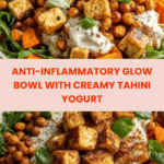 This Anti-Inflammatory Glow Bowl with Tahini Yogurt is a vibrant, nutrient-packed meal combining protein-rich quinoa, roasted sweet potatoes, crispy spiced chickpeas, fresh spinach, and creamy avocado. Topped with a tangy tahini yogurt sauce infused with lemon and warming spices, this bowl promotes wellness and satisfies with its delightful flavors and textures.