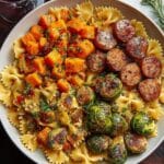 This comforting and flavorful autumn dinner features roasted butternut squash and Brussels sprouts paired with bow tie pasta and smoky cooked sausage, all tossed in a fragrant garlic butter sauce and garnished with fresh thyme. It’s a hearty, warm meal perfect for fall evenings.