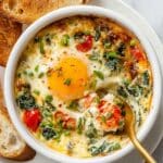 Baked Feta Eggs is a vibrant and flavorful breakfast or brunch dish featuring roasted cherry tomatoes, bell pepper, red onion, and garlic combined with creamy feta cheese and aromatic herbs. This dish is baked until bubbly and topped with fresh spinach and eggs baked until perfectly set. Served with crusty bread, it offers a delicious and nutritious meal packed with Mediterranean flavors.