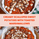 Scalloped sweet potatoes are a comforting and flavorful side dish perfect for holidays or any cozy dinner. Thinly sliced sweet potatoes are baked in a warm spiced butter sauce, topped with crunchy pecans and toasted marshmallows for a delightful contrast of textures and flavors.