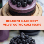 The Blackberry Velvet Gothic Cake is a stunning dessert featuring rich cocoa layers paired with a luscious blackberry filling and fluffy whipped cream. Its dramatic dark colors and fresh decorations make it perfect for special occasions or an elegant treat.