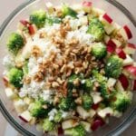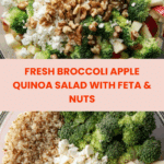 A refreshing and healthy Broccoli Apple Quinoa Salad featuring fluffy quinoa, crunchy toasted nuts, crisp broccoli, sweet honeycrisp apple, and tangy feta cheese, all tossed in a zesty lemon-Dijon dressing. Perfect for a nutritious lunch or light dinner.
