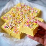 A close-up view of a square piece of light yellow fudge with a soft, slightly crumbly texture, decorated with small, colorful sprinkles in pink, green, yellow, white, and red scattered across the surface. The fudge is one layer thick, neatly cut into smaller squares, resting on white parchment paper that lines a white plate with a shiny look. A woman's hand holds one piece in the foreground, showing the thickness and texture clearly against the white marbled surface background. Photo taken with an iphone --ar 4:5 --v 7