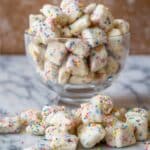 Keywords: Cake Batter Puppy Chow, Puppy Chow Recipe, White Chocolate Snack Mix, Party Snack, Chex Mix Dessert