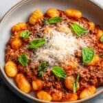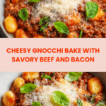 This Cheesy Gnocchi Bake is a hearty, comforting dish combining tender gnocchi with a rich, flavorful beef and vegetable tomato sauce, topped with golden melted cheddar cheese and fresh basil. Perfect for a cozy family dinner or an easy weeknight meal, it brings together simple ingredients into a delicious baked pasta bake with a cheesy crust.