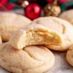 A close-up view of soft, round cookies with a light golden color and a slightly cracked surface, sprinkled with granulated sugar on top. One cookie is in the center with a large bite taken out, revealing a soft, crumbly interior that matches the cookie's pale golden color. The cookies are resting closely together on a white marbled texture. In the background, out of focus, there is a red-and-green plaid cloth and a small red ornament adding a festive touch. Photo taken with an iphone --ar 4:5 --v 7