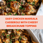This Chicken Marsala Casserole combines tender bite-sized chicken pieces with sautéed mushrooms, aromatic herbs, and a rich Marsala wine sauce, baked to perfection with gooey mozzarella, Parmesan cheese, and a crispy breadcrumb topping. A comforting and flavorful one-dish meal perfect for weeknight dinners or gatherings.