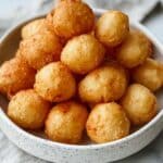 A white speckled bowl filled with around twenty small, golden-brown fried dough balls, each ball having a slightly rough, crispy texture with some areas lighter and others darker golden. The dough balls are piled loosely, showing their round, irregular shapes. The bowl sits on a white marbled surface with a hint of a soft cloth underneath. Photo taken with an iphone --ar 4:5 --v 7