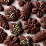 Chocolate Spritz Cookies are buttery and tender with a rich cocoa flavor, perfect for any occasion. These delicate, pressed cookies are easy to make and fun to decorate with melted chocolate and sprinkles.
