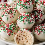 - Coat the Balls and Add Sprinkles: Dip each rice krispie ball into the melted white chocolate until fully coated. Use a fork to lift and gently tap off excess chocolate. Return the coated balls to the parchment-lined tray and immediately sprinkle with red, green, and white nonpareils before the chocolate sets.
