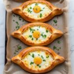 Keywords: Khachapuri, Georgian bread, cheese bread, farmers cheese, feta, mozzarella, stuffed bread, savory bread, boat-shaped bread, traditional Georgian recipe