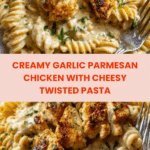 This Creamy Garlic Parmesan Chicken with Cheesy Twisted Pasta is a comforting and flavorful meal perfect for any night of the week. Tender chicken breasts are seared to golden perfection and smothered in a rich garlic Parmesan sauce, paired with perfectly cooked twisted pasta.