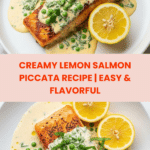 This Creamy Lemon Salmon Piccata recipe features tender, golden-browned salmon fillets cooked to perfection and finished with a bright, tangy, and rich creamy lemon-caper sauce. The dish strikes a perfect balance of fresh citrus brightness, savory garlic, and buttery richness, making it an elegant yet easy-to-make entrée ideal for weeknight dinners or special occasions.