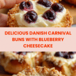 Danish Carnival Buns with Vanilla Cheesecake Delight are a perfect treat for any occasion. Soft, fluffy buns filled with creamy vanilla cheesecake and topped with sweet blueberry compote and a buttery crumble make every bite irresistible. These buns bring a taste of Danish celebration right to your home kitchen.