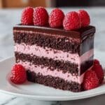 A decadent Dark Chocolate Raspberry Mousse Cake featuring a moist cocoa-infused cake layered with a luscious raspberry mousse and topped with a glossy dark chocolate ganache. This elegant dessert balances rich chocolate flavors with the tangy sweetness of fresh raspberries, perfect for special occasions or indulgent treats.