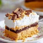 A slice of layered dessert on a white plate with a floral pattern, placed on a white marbled surface. The dessert has four layers: the bottom layer is crumbly and golden brown, the second layer is thin and dark chocolate, the third layer is thick and creamy light peanut butter color, and the top layer is fluffy and white whipped cream. The whipped cream layer is decorated with small pieces of peanut butter chocolate candy and crushed nuts scattered on top. In the background, the whole dessert is slightly blurred. Photo taken with an iphone --ar 4:5 --v 7