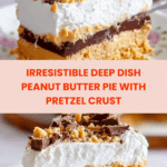 A decadent Deep Dish Peanut Butter Pie featuring a crunchy pretzel crust, a smooth peanut butter cream cheese filling, and a chocolate layer for added richness. This no-bake pie combines salty and sweet flavors with a creamy, fluffy texture, topped with Reese’s Mini Peanut Butter Cups for extra peanut butter goodness and decorative crunch.