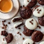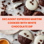 Espresso Martini Cookies combine the rich flavors of coffee, chocolate, and a hint of rum extract for a deliciously indulgent treat. These cookies feature a fudgy texture with a smooth white chocolate dip and a coffee bean garnish, perfect for coffee lovers and dessert enthusiasts alike.