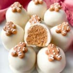 The image shows a group of round white chocolate balls placed closely together on a white plate. Each ball has a small gingerbread man cookie on top, which is golden brown with white icing details. One of the balls in the center is cut open, revealing a soft, crumbly light brown cookie dough inside. The white chocolate coating is smooth and shiny. In the background, there is a red cloth resting on a white marbled surface. photo taken with an iphone --ar 4:5 --v 7