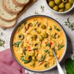 A hearty and flavorful Green Olive Soup combining creamy coconut, tangy sundried tomatoes, and tender chickpeas with fragrant herbs and nutritious spinach. This comforting soup features tender orzo pasta and green olives for a unique twist, perfect for a satisfying vegetarian meal.