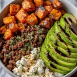 - Assemble Bowls: Once the sweet potatoes and ground beef are ready, start building your bowls. In each serving bowl, layer a generous portion of roasted sweet potatoes followed by the seasoned ground beef. Add sliced avocado and a scoop of cottage cheese on top for creaminess.