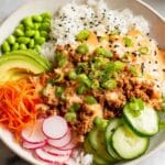 - Assemble the Rice Bowls: In serving bowls, layer cooked rice and your choice of shredded carrots, sliced cucumbers, shelled edamame, pickled onions, avocado, shredded cabbage, and other desired vegetables. Spoon the warm ground turkey mixture over the rice and vegetables. Drizzle with additional Bang Bang sauce, and garnish with sliced green onions and sesame seeds for extra color and crunch.