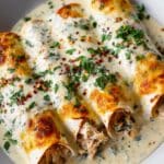 - Assemble the enchiladas: After all tortillas are rolled and placed in the dish, pour the remaining white sauce evenly over them. Sprinkle the remaining 1/4 cup of shredded cheese over the top.