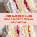 Keywords: angel food cake, raspberry cream cake, Italian meringue, mascarpone cream, layered cake, airy cake dessert, homemade angel food cake, raspberry preserves