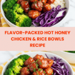These Hot Honey Chicken & Rice Bowls combine tender, spicy-sweet chicken cooked in a sticky hot honey sauce with roasted broccoli, vibrant purple cabbage, and fluffy rice. Perfect for a flavorful weeknight dinner, this dish balances heat and sweetness with simple ingredients and easy roasting and stovetop cooking methods.
