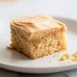 A close-up of a small square slice of cake on a white plate, featuring two layers: a bottom layer of soft, light brown crumbly cake, and a top layer of smooth, creamy light brown frosting. There are a few crumbs scattered around the cake on the plate, and the background is a white marbled texture. The photo taken with an iphone --ar 4:5 --v 7