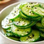 A refreshing and simple Japanese cucumber salad featuring thinly sliced cucumbers dressed in a tangy rice wine vinegar and soy sauce mixture, accented with toasted sesame seeds. Perfect as a light side dish or appetizer, this salad balances crisp textures with a sweet and savory dressing, ready in minutes without cooking.