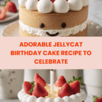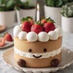 This Jellycat Birthday Cake is a delightful and visually charming layered cake featuring moist vanilla sponge layers, whipped cream, and strawberry jam filling. Decorated with fresh strawberries, piped vanilla and chocolate whipped cream, and a sweet chocolate face, this cake is perfect for birthdays and special celebrations. The recipe combines a light, airy cake with creamy whipped layers and a touch of fruity jam for a balanced, festive dessert.