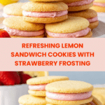 Keywords: lemon sandwich cookies, strawberry frosting, lemon cookies, sandwich cookies, homemade frosting, fresh strawberry frosting, dessert cookies, lemon dessert