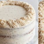 A close-up view of a three-layer cake covered with creamy white frosting that has small brown specks. The frosting is spread evenly on the top and sides but allows parts of the cake layers to show through slightly. Around the top edge, there is a decorative border made of piped swirls of the same frosting, giving it a textured and elegant look. The cake is set against a white marbled background. Photo taken with an iphone --ar 4:5 --v 7