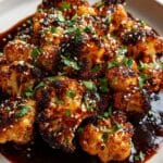 A flavorful and spicy Maple Sriracha Roasted Cauliflower dish featuring tender, caramelized florets coated in a sweet and tangy glaze made from maple syrup, sriracha, soy sauce, and rice vinegar. Perfect as a healthy side or a vegetarian main course, garnished with sesame seeds and green onions for added texture and freshness.