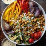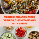 These Mediterranean Roasted Veggie & Chickpea Bowls are vibrant and packed with flavor. Roasted vegetables and chickpeas pair perfectly with a creamy tahini dressing, making a satisfying and healthy meal for any day of the week.