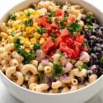 Keywords: Mexican pasta salad, black bean pasta salad, chipotle dressing, summer salad, vegetarian pasta salad