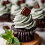 15. Pipe Frosting: Fill a piping bag fitted with a Wilton 1M tip with the buttercream frosting. Pipe swirls onto each cupcake and garnish each with an Andes mint.