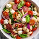 This vibrant Pizza Bean Salad combines hearty giant white beans with classic pizza-inspired ingredients like pepperoni, mozzarella balls, and fresh vegetables. Tossed in a zesty hot honey oregano dressing, this flavorful salad is perfect as a light meal or a refreshing side dish served at room temperature or chilled.