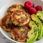 A white bowl holds several small, round patties with a golden-brown crust that looks crispy and slightly uneven, showing bits of green herbs inside. To the side of the patties are two ripe red raspberries with a textured surface and a few thick slices of bright green avocado topped with chopped fresh herbs. The bowl is placed on a white marbled texture background, giving a clean and fresh look. photo taken with an iphone --ar 4:5 --v 7