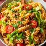 Keywords: Taco pasta salad, ground beef pasta salad, Tex-Mex salad, easy pasta salad recipe, Doritos pasta salad