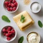 - Assemble the Mille-Feuille Cookies: Once the puff pastry pieces are cool, begin layering. Place one piece on a clean surface and pipe or spoon dollops of vanilla whipped cream, leaving space for cream to peek through the sides. Add a second pastry layer and repeat the cream application. Finish with a third pastry layer, top with a final layer of whipped cream, and garnish with 2-3 fresh raspberries. Optionally, add a fresh mint leaf for an attractive and fresh touch. Repeat for remaining pieces.