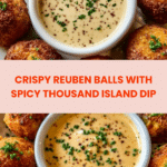 Crispy and flavorful Reuben Balls filled with corned beef, sauerkraut, Swiss cheese, and cream cheese, served with a spicy Thousand Island dipping sauce. Perfect as an appetizer or party snack, these golden-fried bites offer classic Reuben flavors in a fun, handheld form.