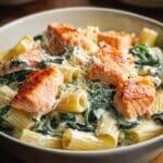 This Salmon Spinach Pasta recipe combines tender seared salmon with a creamy Parmesan sauce and fresh baby spinach, all tossed with perfectly cooked spaghetti. A hint of lemon zest and juice brightens the dish, creating a rich and satisfying meal ideal for a comforting dinner.