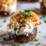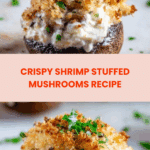These Shrimp Stuffed Mushrooms are a delicious appetizer featuring baby bella mushrooms filled with a creamy mixture of sautéed shrimp, cream cheese, mayo, garlic, and lemon juice, topped with a crispy Italian breadcrumb and parmesan crust, then baked to golden perfection.