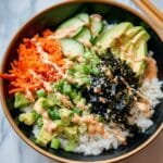 A refreshing and easy-to-make deconstructed sushi bowl inspired by the classic California roll. This recipe features perfectly cooked sushi rice topped with shredded imitation crab, fresh cucumber, creamy avocado, nori strips, and toasted sesame seeds. It’s a quick and satisfying way to enjoy sushi flavors without the rolling.