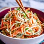 - Combine the salad: Add the julienned vegetables and shredded kani into the bowl with the dressing. Gently toss all ingredients together until everything is evenly coated without crushing the delicate kani or vegetables.