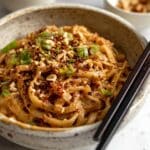 - Serve: Plate the noodles and garnish with crushed peanuts, sliced scallions, and extra red pepper flakes if desired. Serve immediately alongside your choice of vegetables or protein.