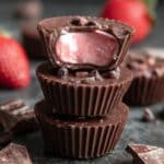 The image shows three chocolate cups stacked with one on top cut in half, revealing a smooth pink filling inside. The outer layer is shiny dark brown chocolate with ridged sides, and the top has small chocolate pieces scattered. The surface beneath is a dark textured stone with a few chunks of chocolate and a blurred red strawberry in the background. photo taken with an iphone --ar 4:5 --v 7