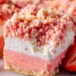 Keywords: Strawberry brownies, strawberry cake mix dessert, creamy frosting brownies, crunchy cookie topping, white chocolate chip brownies